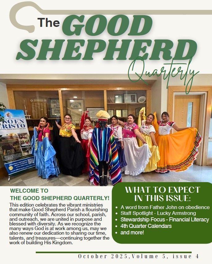 Features on Good Shepherd School and Catholic education; Staff Spotlight on Ben Loftus; Pt. 2 of the Story of Rev. Thomas Major; Garden Club News; Details on The Great Gala; and reports on Knights of Columbus, St. Vincent de Paul, Finance Council, and Stewardship plus lots of photos.